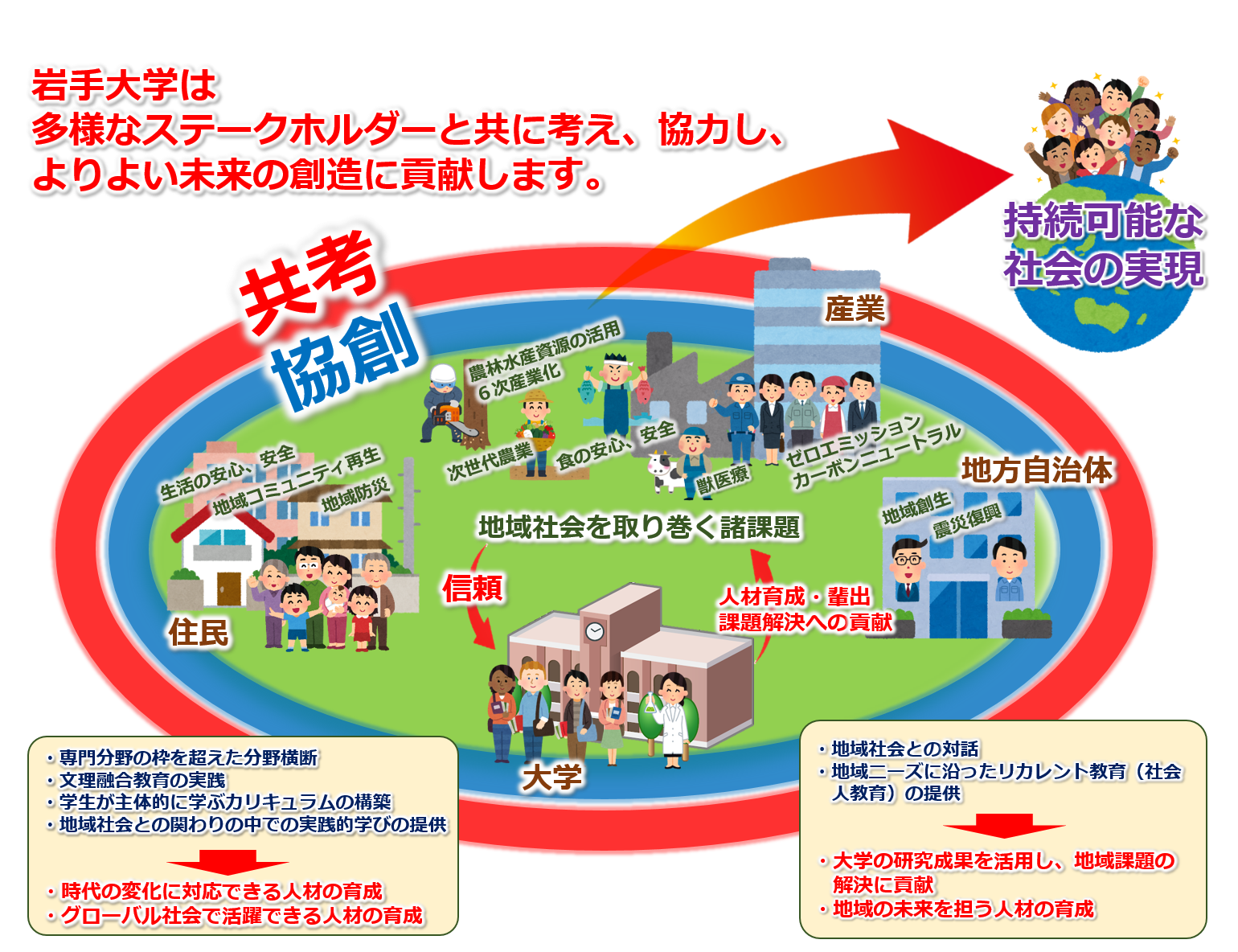 岩手大学が2030年を見据え、目指すべき方向性を示すものとして『岩手大学ビジョン2030』を策定しました。ビジョンの実現に向けた具体的道筋は、学生、教職員と共に考え、そして協力して創りあげるべきであるとの考えから『共考と協創(共に考え、協力して創る)』を行動規範に掲げ、岩手大学総体としてビジョン実現を目指したいと考えています。