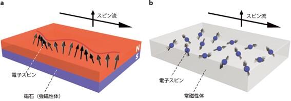 スピントロニクスで用いられる現象や機能性を理解するためには電子のスピンに由来する磁気の流れ、スピン流が重要な鍵となります。スピン流はその磁気の流れという性質から、金属や磁石などの材料を中心に研究が行われてきました。例えば、金属中では伝導電子によってスピン流が流れます。一方、磁石(強磁性体)の中でスピン流を流すにはスピンの向きが一方向に揃うこと(磁気秩序)が不可欠です(図1a)。このように磁気秩序があれば電気を通さない絶縁体ですらスピン流を流すことができるため、磁石(磁気秩序を持つ材料)については基礎と応用の両面から近年、研究が進められています。