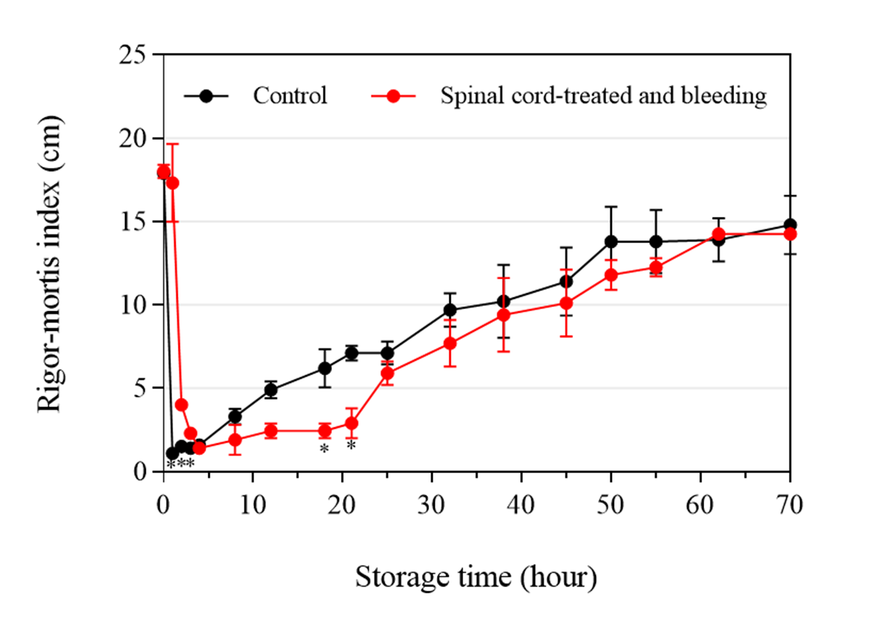 また、神経締めと脱血処理区はドリップロスが少なかったことから、筋肉の品質を維持し、風味に関連する遊離アミノ酸の保持を改善するのに役立つ可能性があることが示唆されました。 pHはどちらの処理でも6.2~6.5の間で変動し、有意差は見られませんでした。