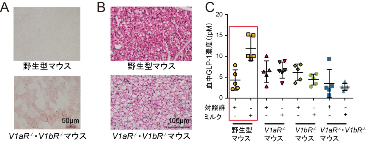 (A) 野生型およびV1aR⁻/⁻・V1bR⁻/⁻マウスの骨格筋の染色像。脂質をOil Red Oにより赤く染色したところ、V1aR⁻/⁻・V1bR⁻/⁻マウスでは、骨格筋に脂質が蓄積していた。(B) 野生型およびV1aR⁻/⁻・V1bR⁻/⁻マウスの褐色脂肪組織の染色像。核と細胞質をHE染色により赤紫色に染色したところ、V1aR⁻/⁻・V1bR⁻/⁻マウスではHE染色で染色されない脂肪滴が増加していた。(C) 各マウスにおける血中GLP-1濃度。野生型マウスではミルク投与時に血中GLP-1濃度が上昇したが(赤枠)、V1aR⁻/⁻マウス、V1bR⁻/⁻マウス、V1aR⁻/⁻・V1bR⁻/⁻マウスでは、上昇しなかった。