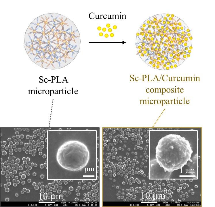 岩手大学理工学部化学コース、科学技術イノベーション推進ラボ「グリーン表面界面ナノ工学ユニット」の芝﨑祐二らの研究グループは、生分解性ポリマーであるポリ乳酸の星型高分子化合物を設計・合成し、光学活性高分子の溶液混合法により対応するステレオコンプレックスミクロ粒子の調製法を確立しました。さらに、このミクロ粒子内にクルクミンを固定化し、長期的に放出可能なドラッグデリバリーシステムの構築に成功しました。