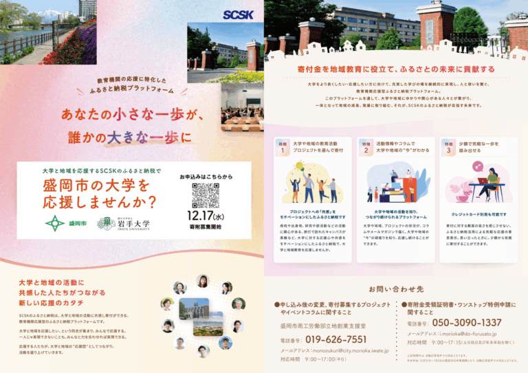 岩手大学は、「イーハトーヴ協創パートナー企業」であるSCSK株式会社が運営する教育機関の応援に特化した「ふるさと納税プラットフォーム」を活用して、盛岡市と連携した「教育機関応援型ふるさと納税」を導入しました。