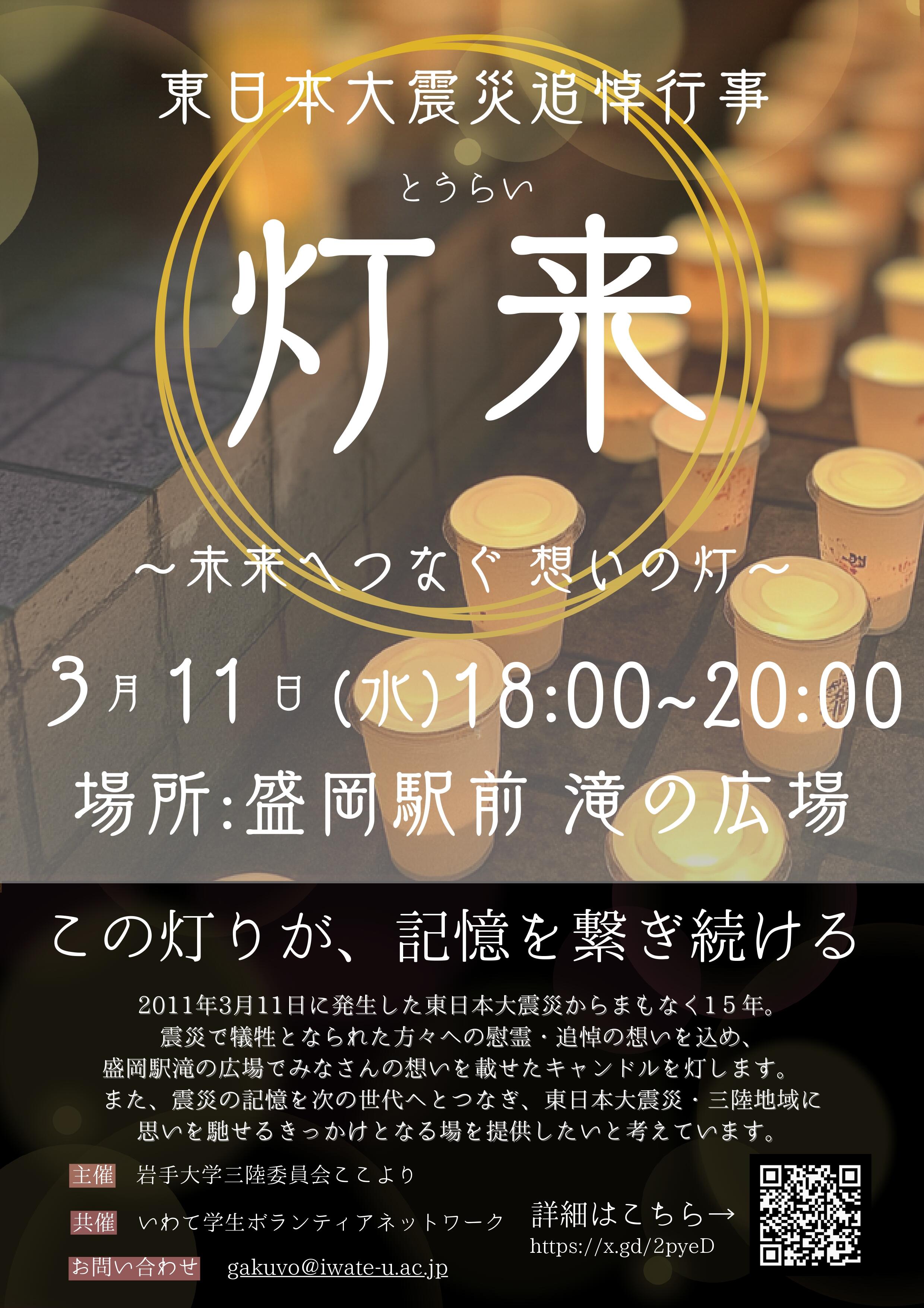 東日本大震災からまもなく15年が経過します。そこで、当会では、東日本大震災によって犠牲になった方々に向けて、慰霊・追悼の気持ちを伝えることを目的として「灯来~未来へつなぐ想いの灯~」を開催します。