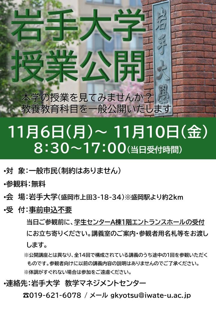 岩手大学では、教養教育科目、一部の専門教育科目を公開する授業公開を行います。