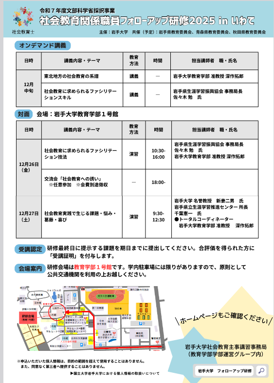 岩手大学では、「社会教育関係職員フォローアップ研修2025 in いわて」を以下のとおり開催いたします。