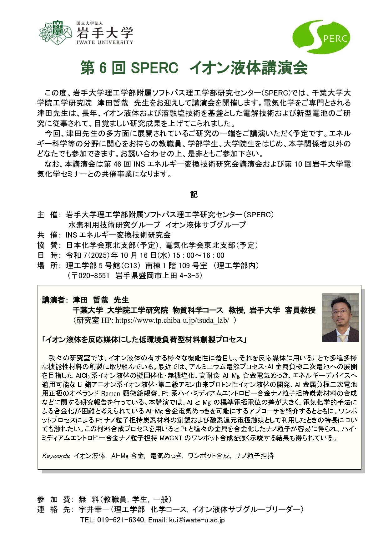 岩手大学理工学部附属ソフトパス理工学部研究センター(SPERC)では、千葉大学大学院工学研究院 津田哲哉 先生をお迎えして講演会を開催します。電気化学をご専門とされる津田先生は、長年、イオン液体および溶融塩技術を基盤とした電解技術および新型電池のご研究に従事されて、目覚ましい研究成果を上げてこられました。