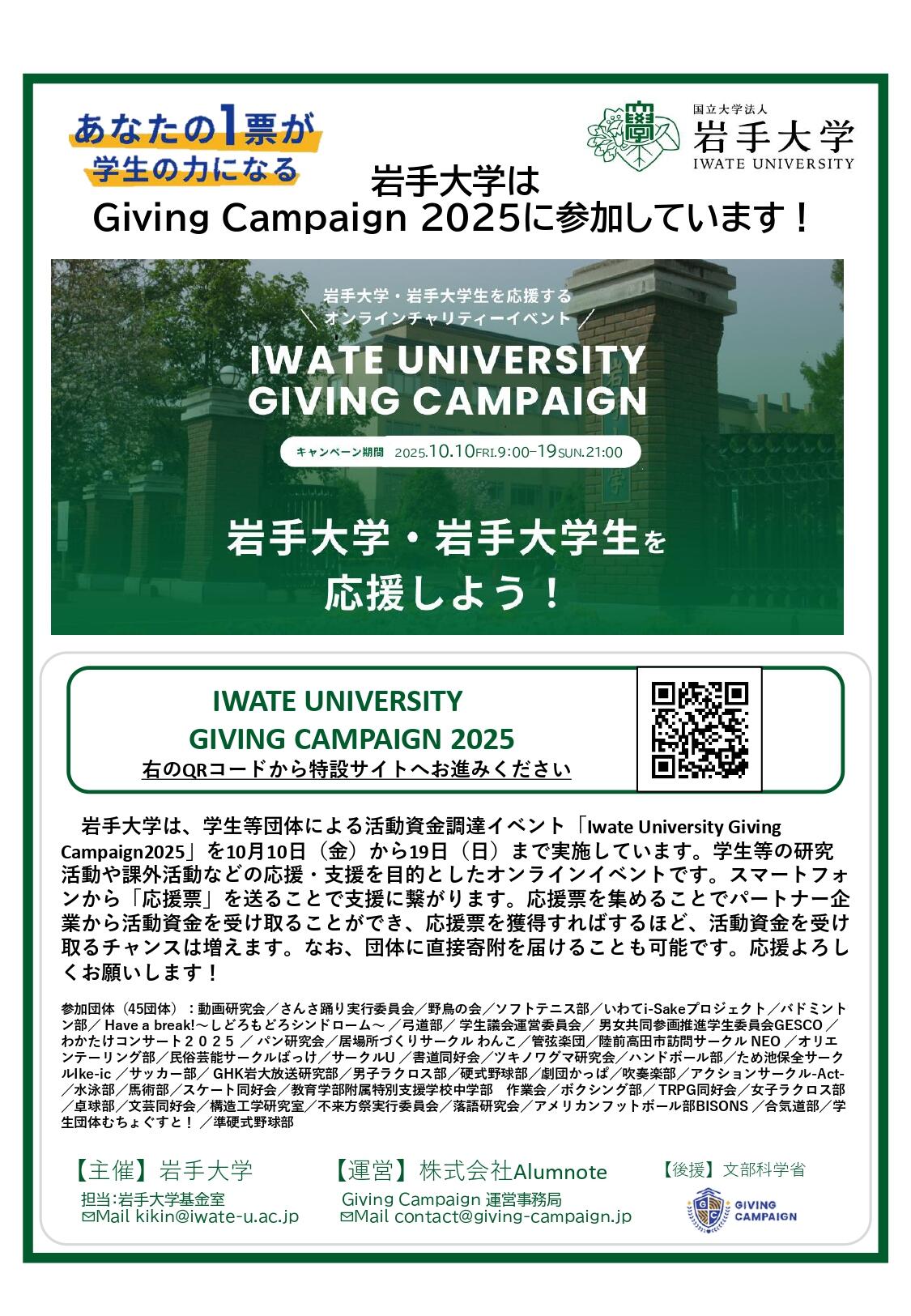 このたび岩手大学は、学生等団体による活動資金調達イベント「Iwate University Giving Campaign 2025」を10月10日(金)から19日(日)まで実施します。