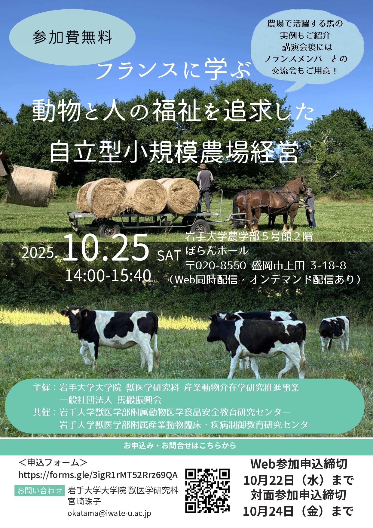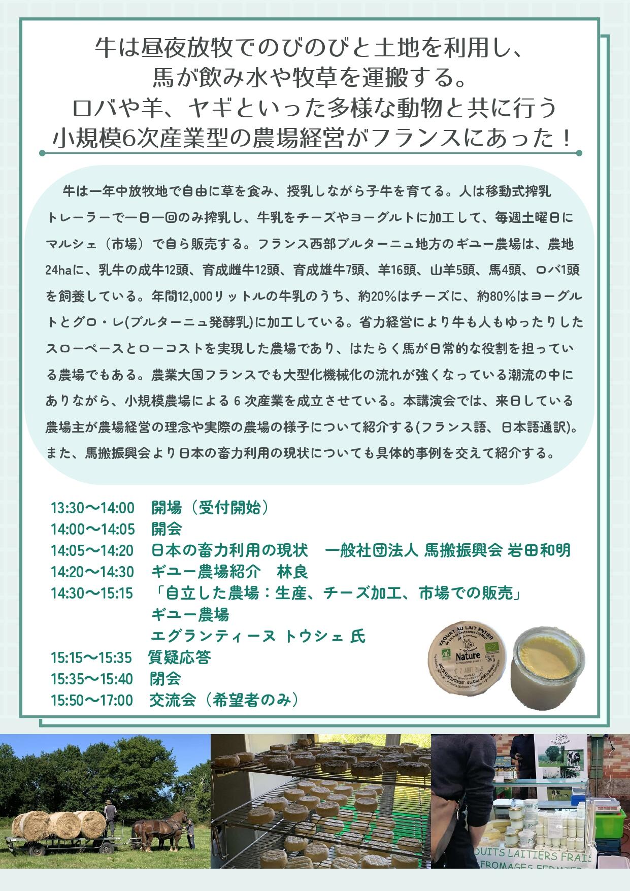 牛は一年中放牧地で自由に草を食み、子牛に授乳しながら子牛を育てる。人は移動式搾乳トレーラーで一日一回のみ搾乳し、牛乳をチーズやヨーグルトに加工して、毎週土曜日にマルシェ(市場)で自ら販売する。フランス西部ブルターニュ地方のギユー農場は、農地24haに、乳牛の成牛12頭、育成雌牛12頭、育成雄牛7頭、羊16頭、山羊5頭、馬4頭、ロバ1頭を飼養している。年間12,000リットルの牛乳のうち、約20%はチーズに、約80%はヨーグルトとグロ・レ(ブルターニュ発酵乳)に加工している。省力経営により牛も人もゆったりしたスローペースとローコストを実現した農場であり、はたらく馬が日常的な役割を担っている農場でもある。農業大国フランスでも大型化機械化の流れが強くなっている潮流の中にありながら、小規模農場による6 次産業を成立させている。本講演会では、来日している農場主が農場経営の理念や実際の農場の様子について紹介する(フランス語、日本語通訳)。また、馬搬振興会より日本の畜力利用の現状についても具体的事例を交えて紹介する。