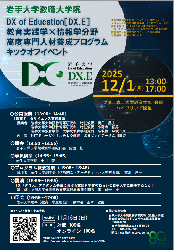 文部科学省補助事業「デジタルと掛けるダブルメジャー大学院教育構築事業~Xプログラム~」の採択を受け、2026年4月から本格実施する「DX of Education [DX.E]教育実践学×情報学分野 高度専門人材養成プログラム」の概要説明・公開授業・講演を行います。