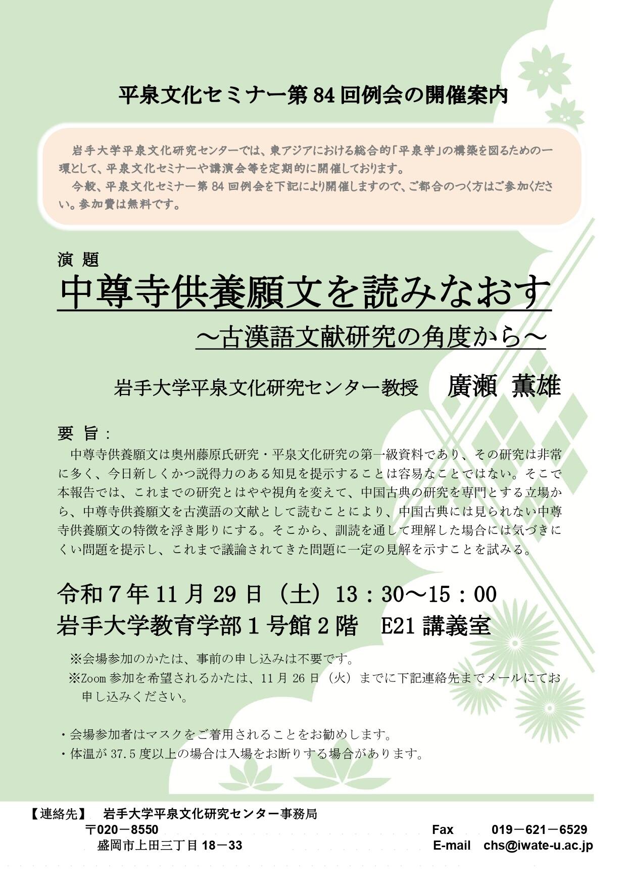 今回、平泉文化セミナー第84回例会を以下のとおり開催しますので、ご都合のつく方は是非ご参加ください。