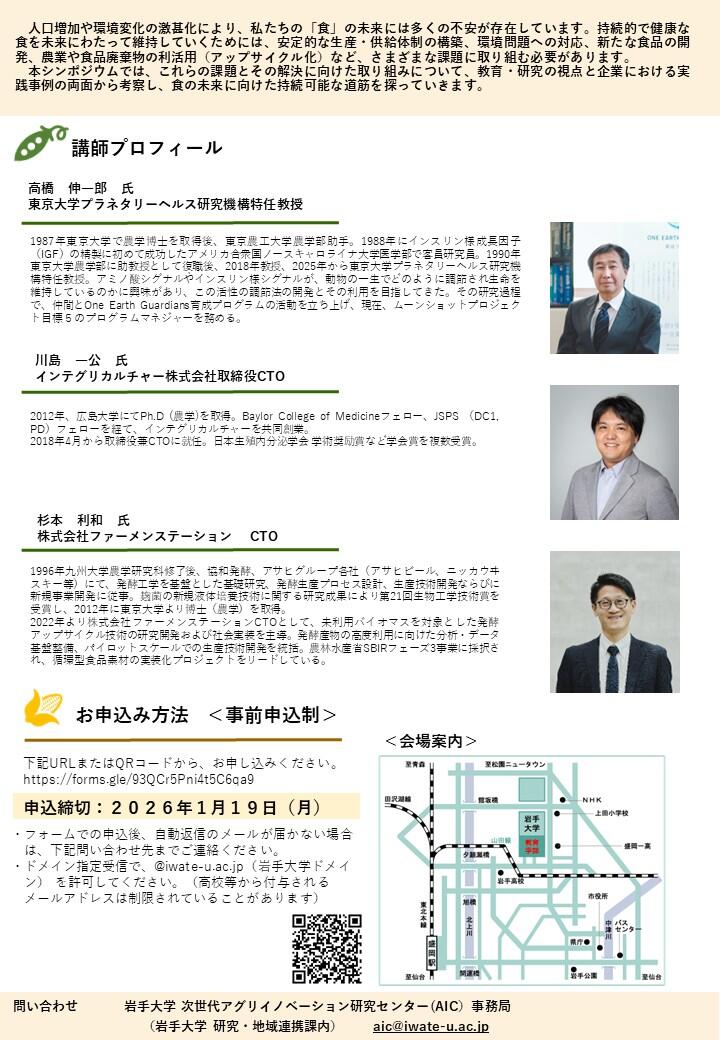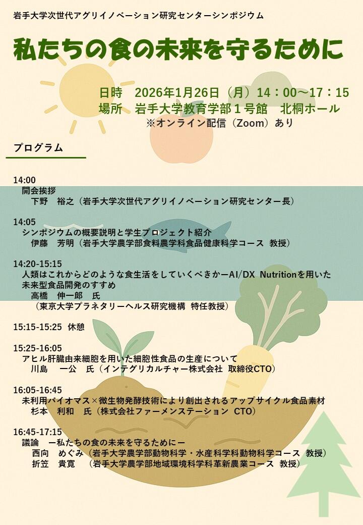 岩手大学次世代アグリイノベーション研究センター(AIC)では、シンポジウム「私たちの食の未来を守るために」 を開催します。