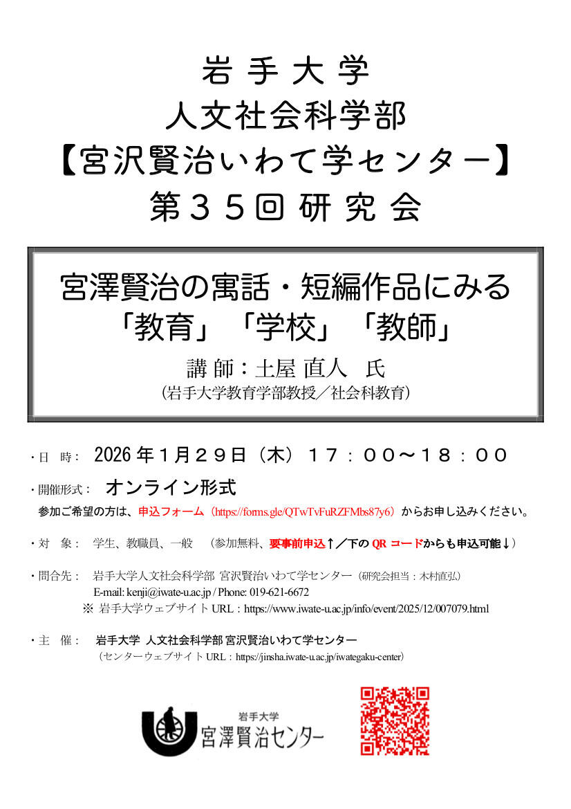 岩手大学 人文社会科学部 宮沢賢治いわて学センター 第35回研究会