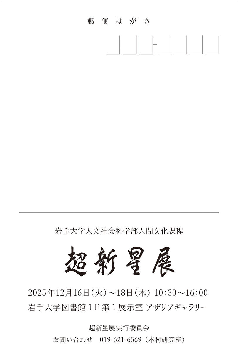 岩手大学人文社会科学部人間文化課程の2年生を中心とする有志「超新星展実行委員会」(「プロジェクト実践演習(基礎)」の履修者)による美術と書道の展覧会「超新星展」を開催いたします。