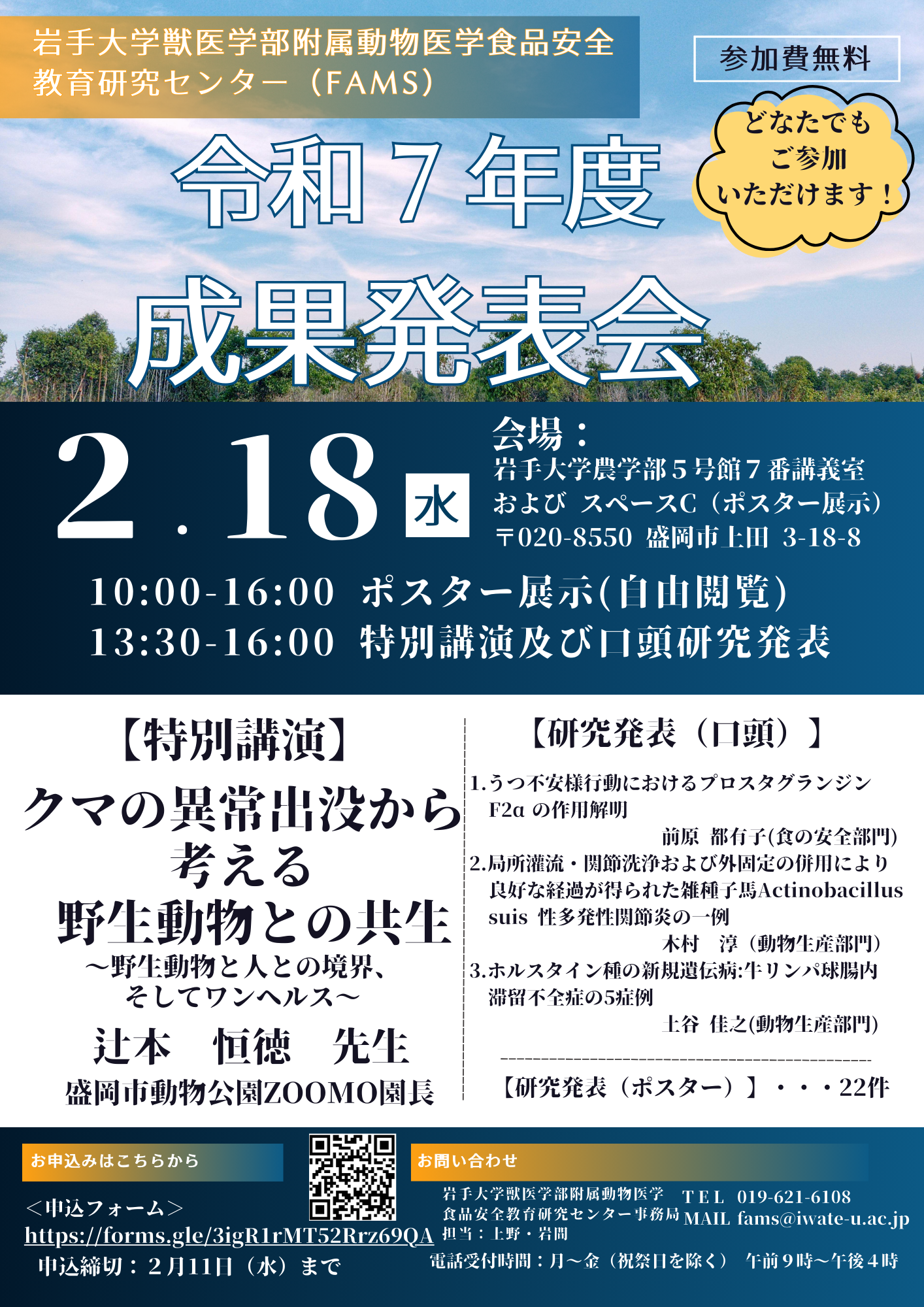 岩手大学獣医学部附属動物医学食品安全教育研究センター(FAMS)では、令和7年度成果発表会を開催します。