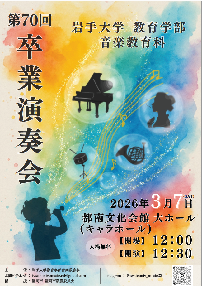 教育学部音楽教育科では、「第70回卒業演奏会」を以下のとおり開催いたします。