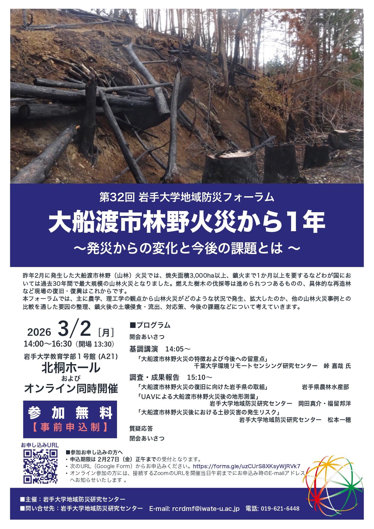 本フォーラムでは、主に農学、理工学の観点から山林火災がどのような状況で発生、拡大したのか、他の山林火災事例との比較を通した要因の整理、鎮火後の土壌侵食・流出、対応策、今後の課題などについて考えていきます。