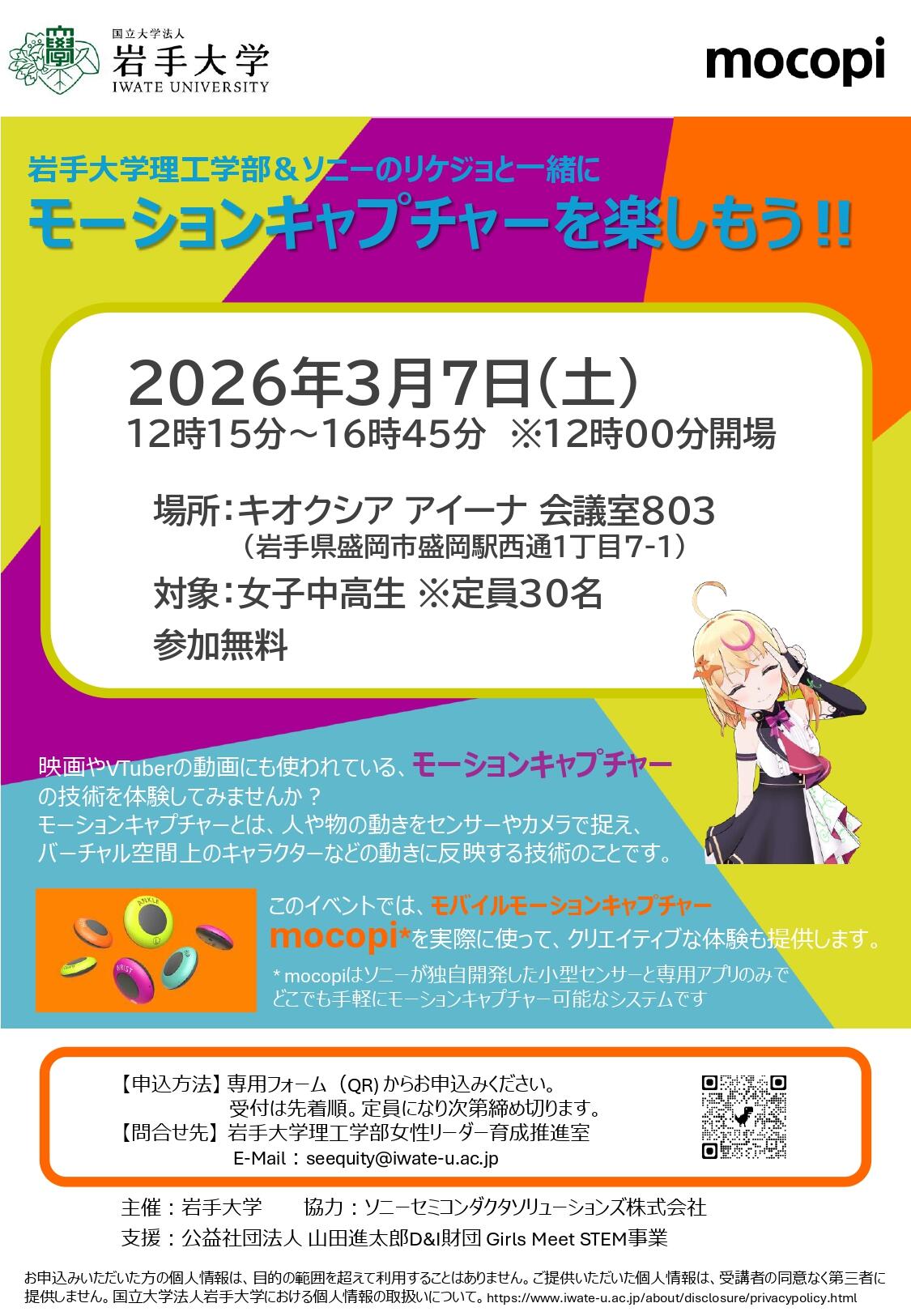 このたび岩手大学理工学部女性リーダー育成推進室では、ソニーセミコンダクタソリューションズ株式会社様の協力を得て「岩手大学工学GIRLS&ソニーの女性エンジニアと一緒にモーションキャプチャーを楽しもう‼」を開催することとなりました。本イベントでは、モーションキャプチャーを使いアバターを作ることで、女子中高生の方々にそのテクノロジーを伝えるとともに、クリエイティブな体験を提供することを目的としています。