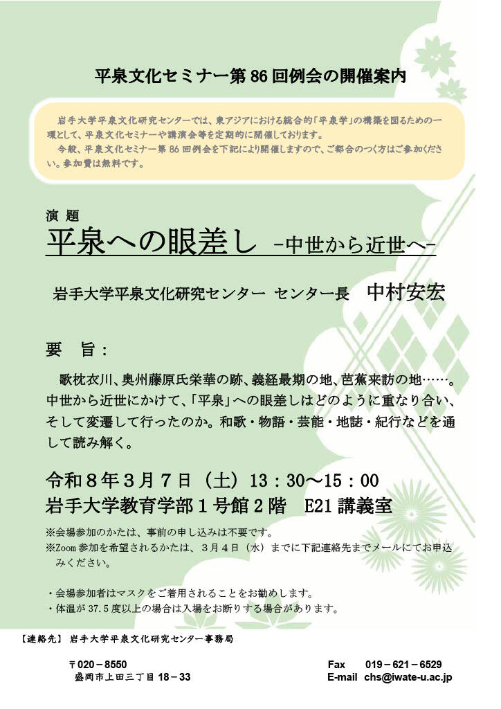 岩手大学平泉文化研究センターでは、東アジアにおける総合的「平泉学」の構築を図るための一環として、平泉文化セミナーや講演会等を定期的に開催しております。