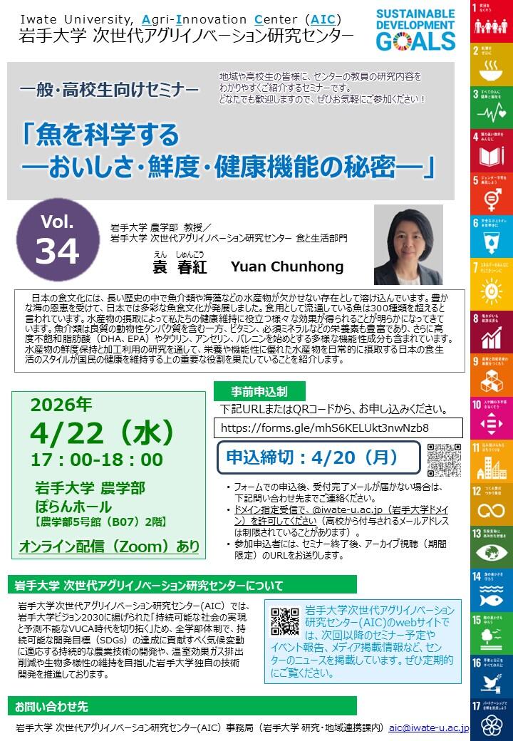 岩手大学次世代アグリイノベーション研究センターでは、一般・高校生向けセミナー(第34回)を開催します。