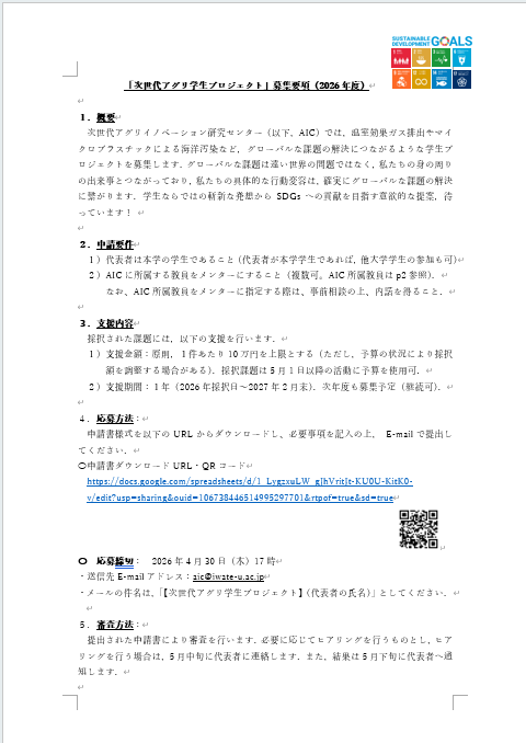 次世代アグリイノベーションセンターでは、温室効果ガス排出やマイクロプラスチックによる海洋汚染などグローバルな課題の解決につながるような学生プロジェクトを募集します。想定されるプロジェクトの案や支援内容は添付ファイルのとおりです。
