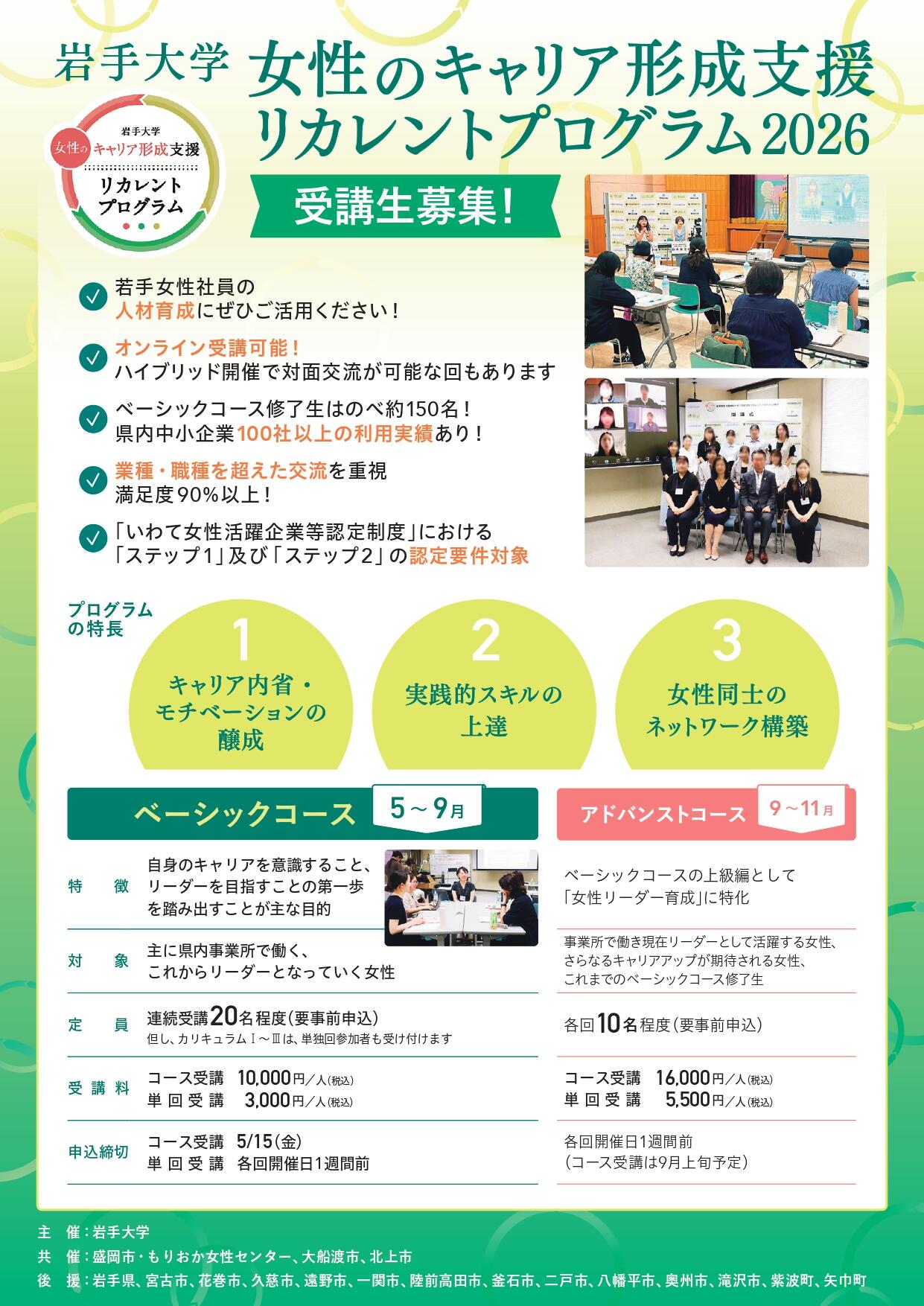 2026年度も「岩手大学女性のキャリア形成支援リカレントプログラム2026」は、「ベーシックコース」と「アドバンストコース」の2コースを開講することとし、受講生募集を開始しました。