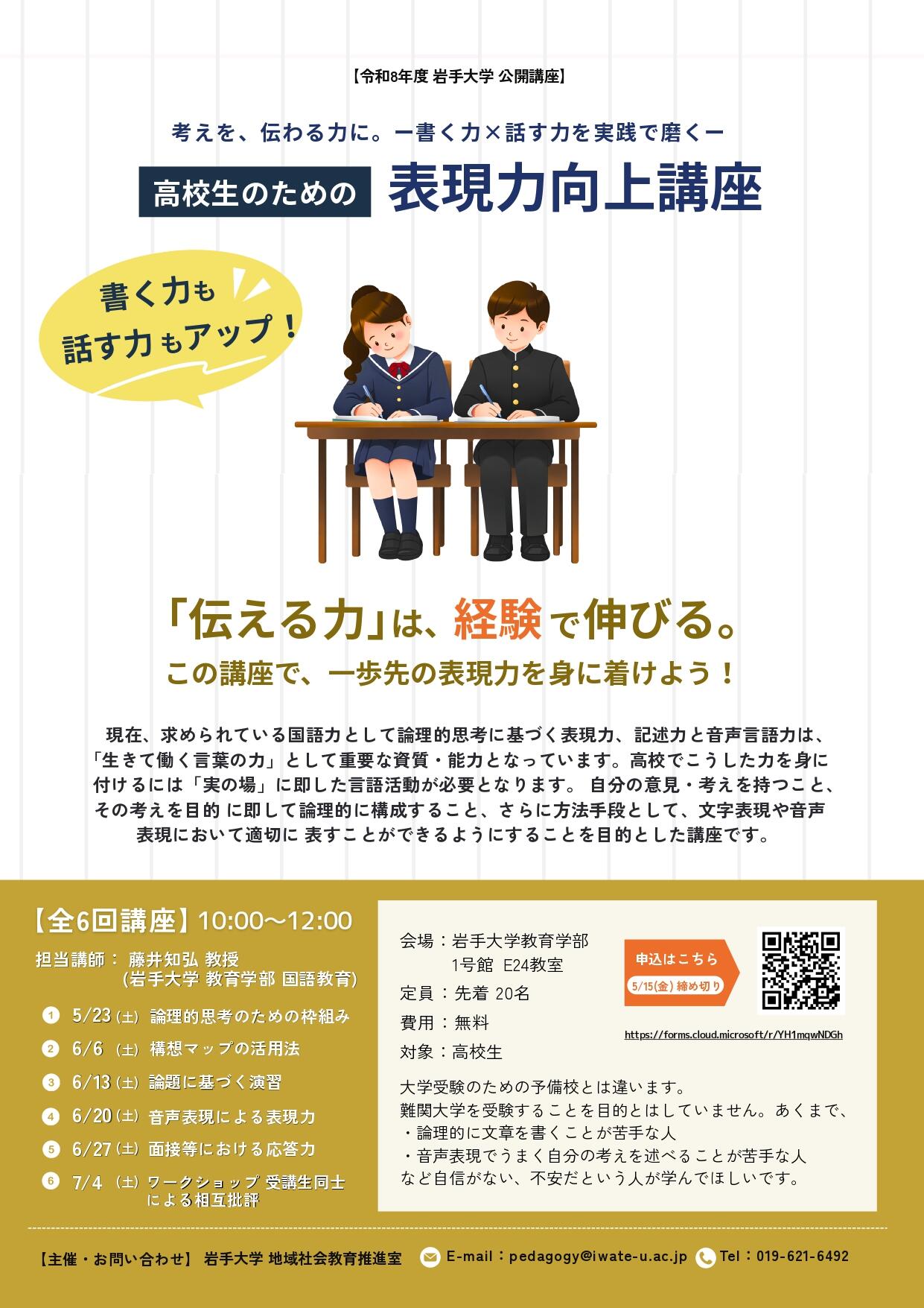 現在、求められている国語力として論理的思考に基づく表現力、記述力と音声言語力は、「生きて働く言葉の力」として重要な資質・能力となっています。高校でこうした力を身に付けるには「実の場」に即した言語活動が必要となります。 自分の意見・考えを持つこと、その考えを目的 に即して論理的に構成すること、さらに方法手段として、文字表現や音声表現において適切に 表すことができるようにすることを目的とした講座です。