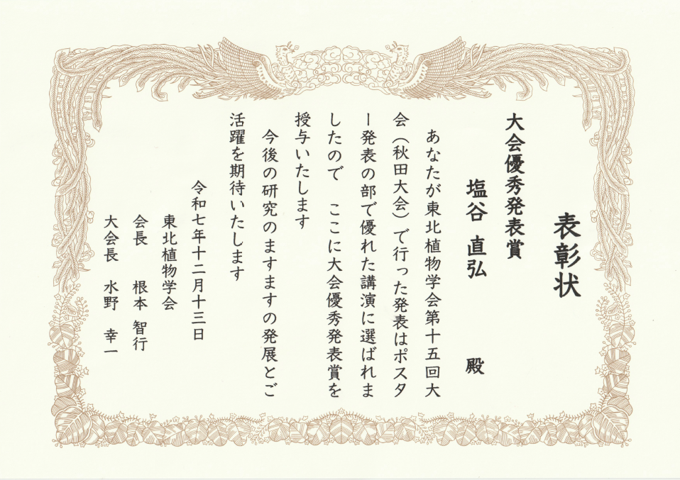 令和7年12月12-13日に秋田市で開催された「東北植物学会第15回大会」にて、連合農学研究科2年塩谷直弘さん(指導教員:山形大学 星野友紀教授)が大会優秀発表賞を受賞しました。本賞は、ポスドク等を含む学生会員による一般講演発表のうち、大会参加者による投票によって、最も優れた発表に対して授与されるものです。