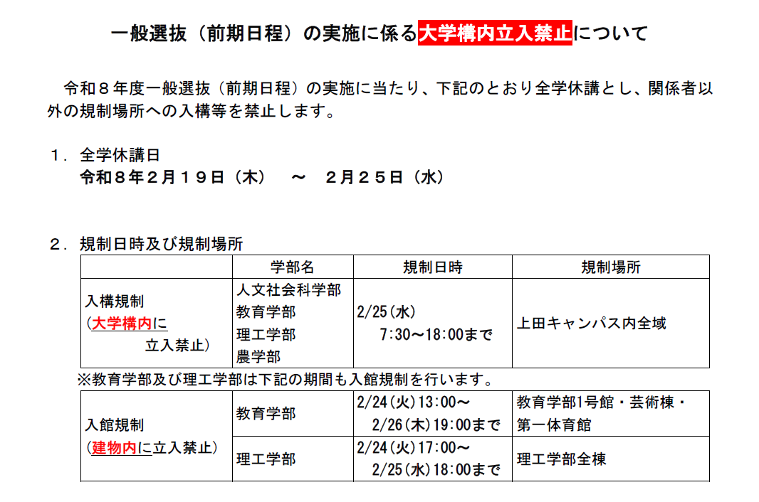 令和8年度一般選抜(前期日程)の実施(令和8年2月25日(水))に伴い、入館・入構を規制いたします。