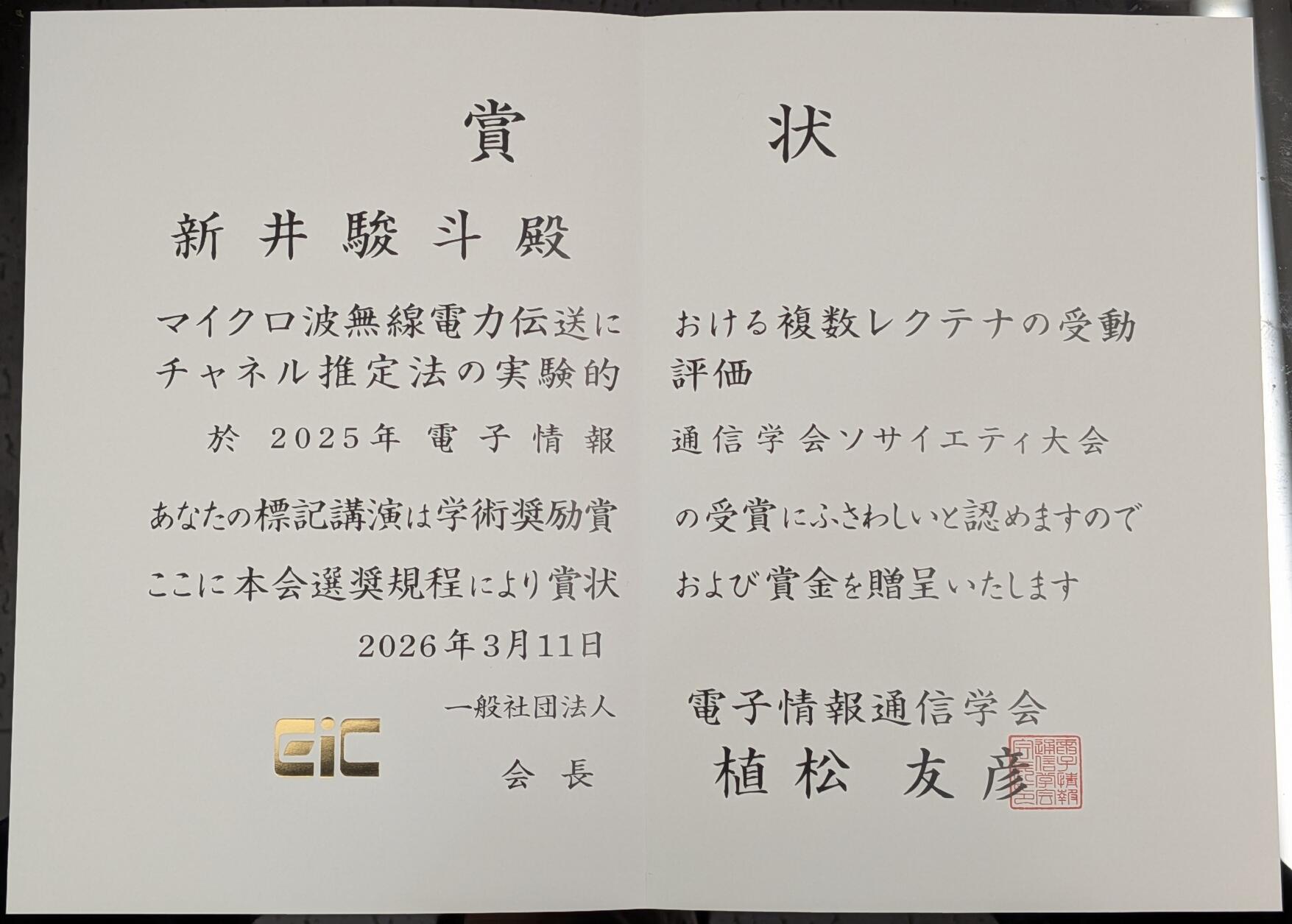 2026年3月9日〜13日に九州産業大学(福岡市)で開催された「2026年電子情報通信学会総合大会」において、本学大学院 理工学研究科(博士課程)システム創成工学専攻の新井駿斗さん(D1)が、電子情報通信学会 学術奨励賞を受賞しました。