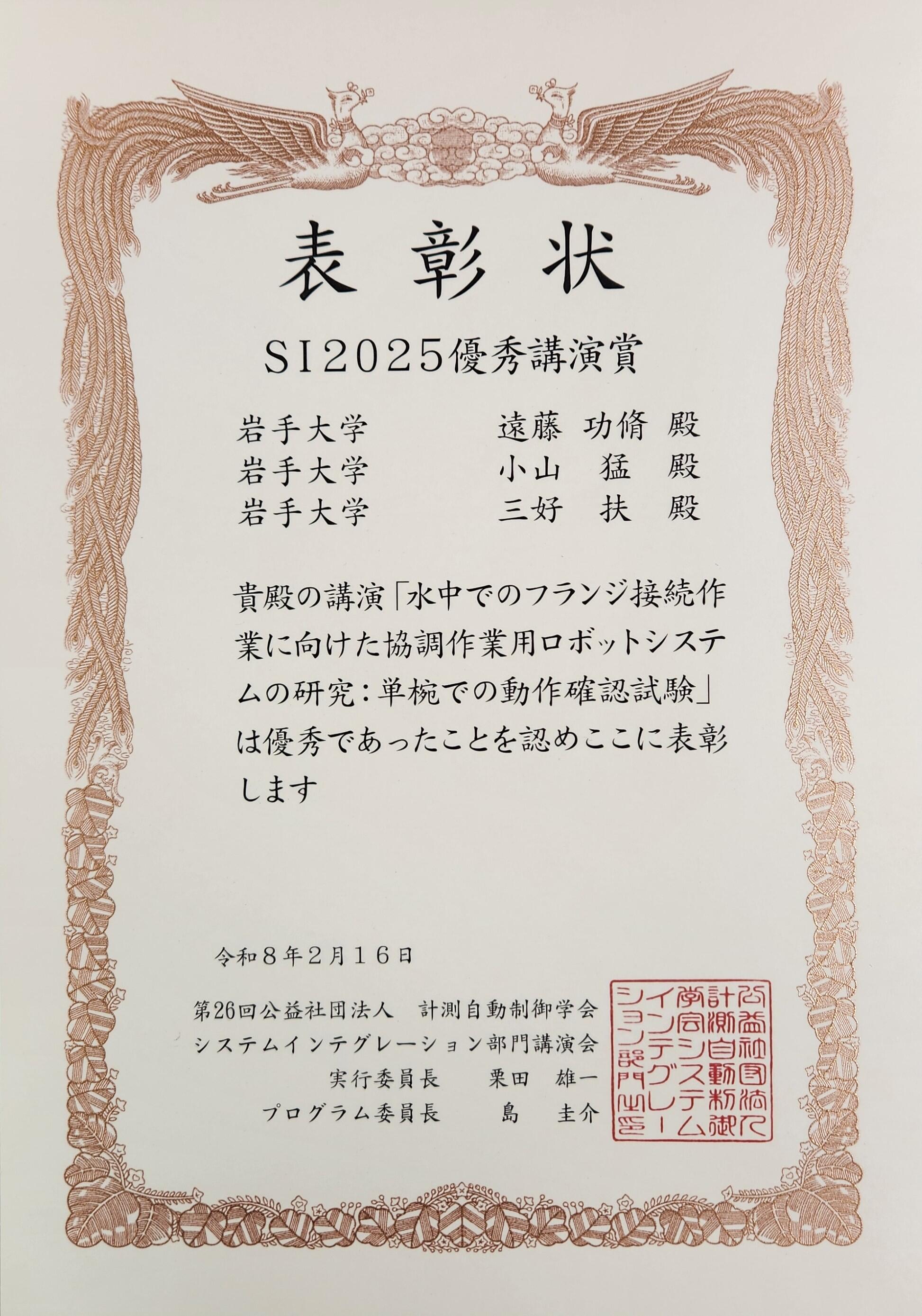 2025年12月10日(水)~12日(月)に広島国際会議場で開催された、「計測自動制御学会 第26回システムインテグレーション部門講演会 SI2025」にて、(現)機械・航空宇宙コース修士2年 遠藤功脩さんが下記の研究発表を行い、優秀講演賞を受賞しました。