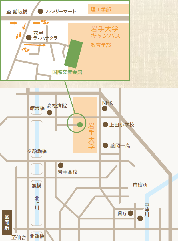 〒020-0066 岩手县盛冈市上田3丁目18番27号(岩手大学校园内) - 交通指南-盛冈站到国际交流会馆