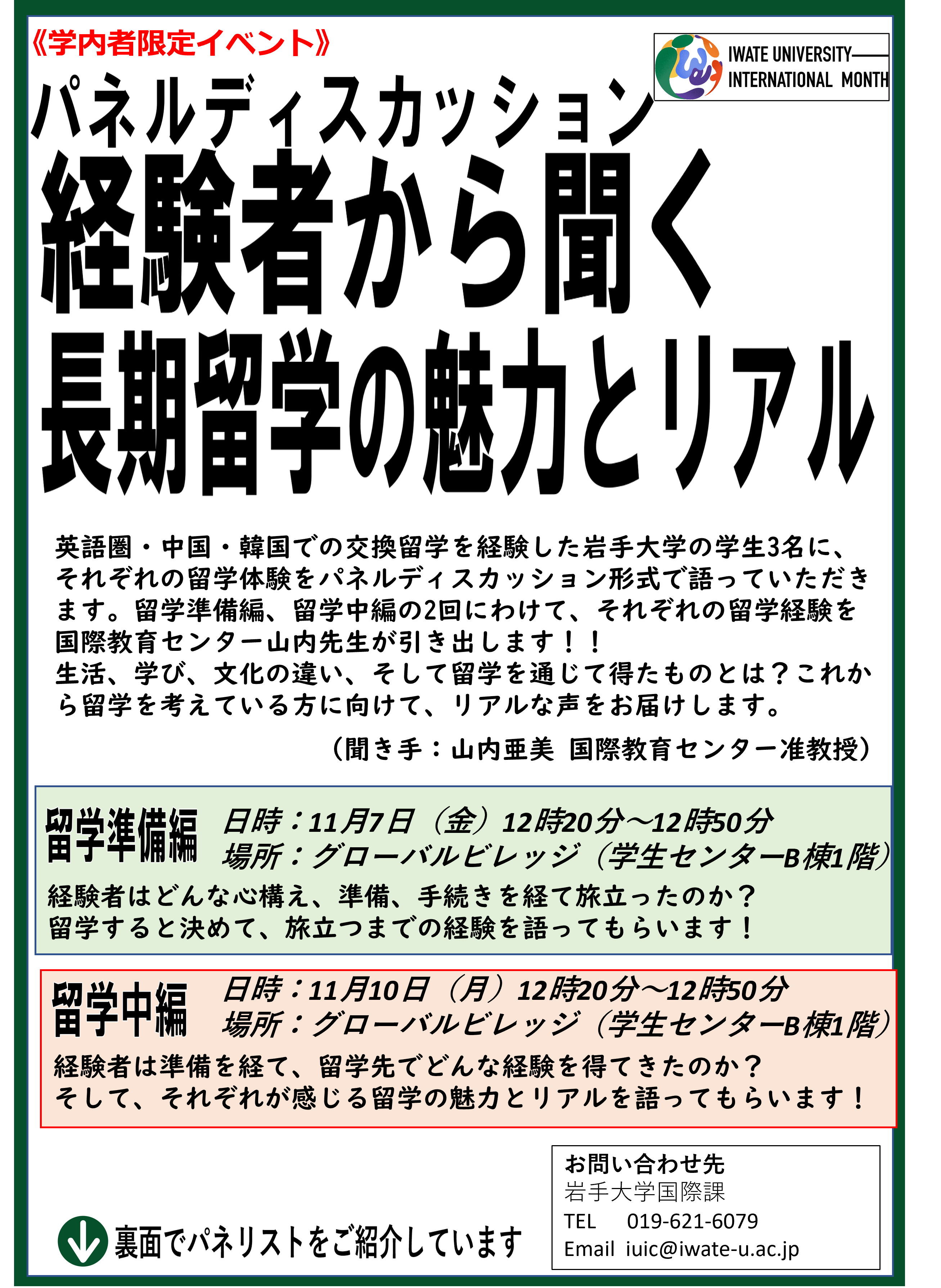 岩手大学では、国際月間の一環として、11月7日と10日に「パネルディスカッション経験者から聞く長期留学の魅力とリアル 」と題し、実際に長期留学を経験された3名の皆様にお集まりいただき、パネルディスカッション形式で、自らの経験をご披露いただきます。