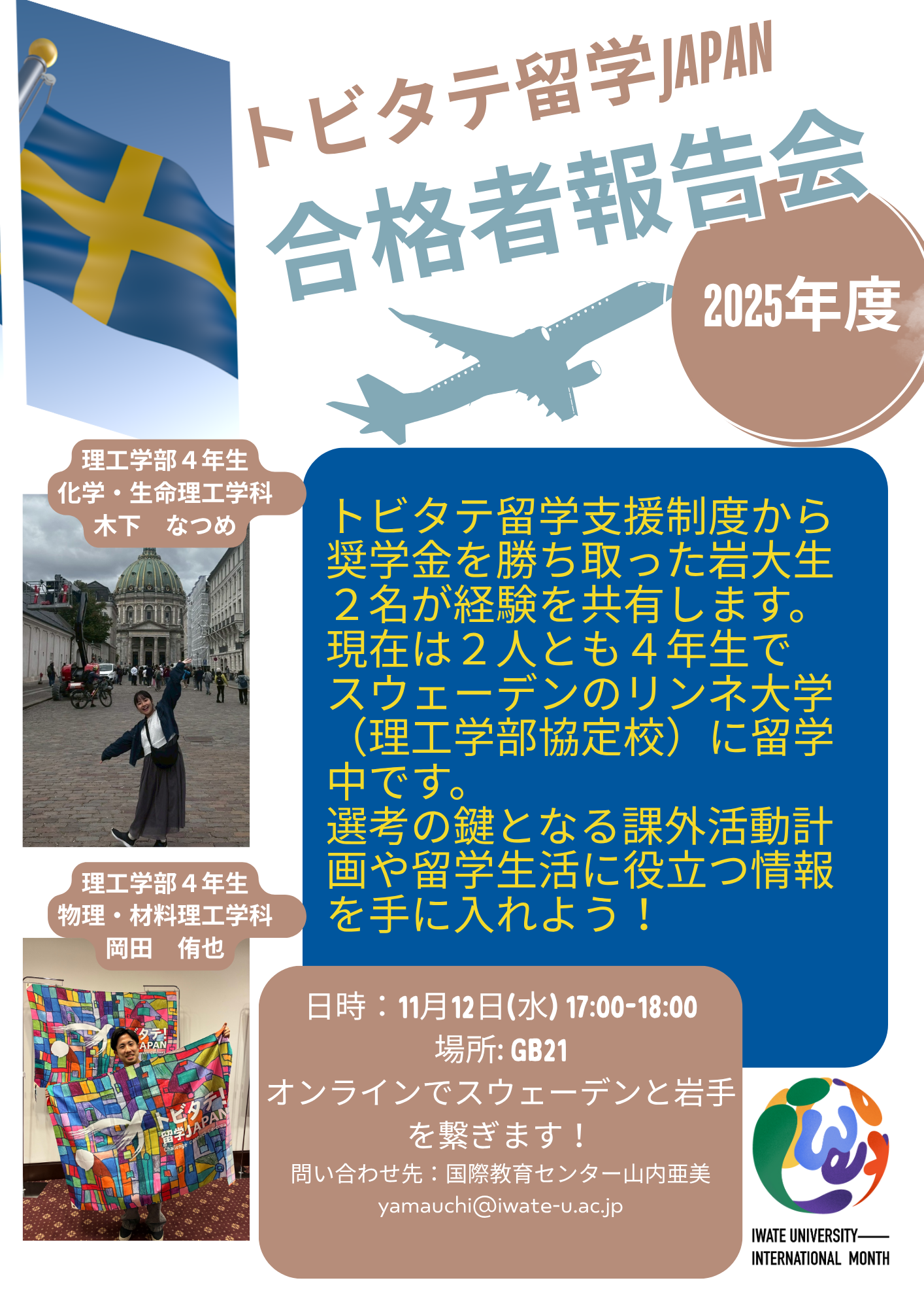 岩手大学では、国際月間の一環として、11月12日に「トビタテ!留学JAPAN合格者報告会」を行います。