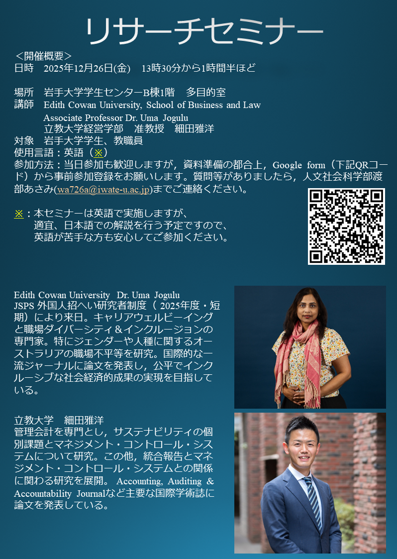 この度、人文社会科学部 渡部あさみ准教授とグローバルビレッジとの共催で、Dr. Jogulu Uma Devi(Senior Lecturer, School of Business and Law, Edith Cowan University, Australia)をお招きし、「ダイバーシティ&インクルージョンケイパビリティ成熟度モデルの活用の有効性」というテーマでリサーチセミナーを開催します。