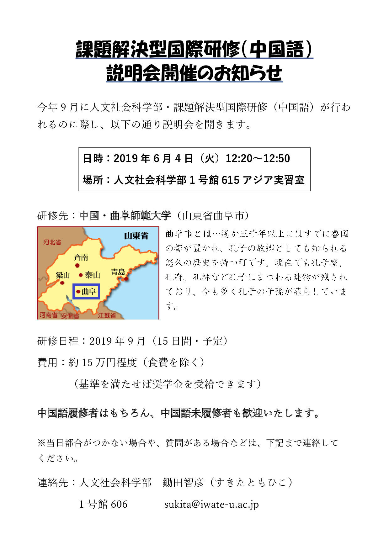 - 課題解決型国際研修(中国語)説明会開催のお知らせ