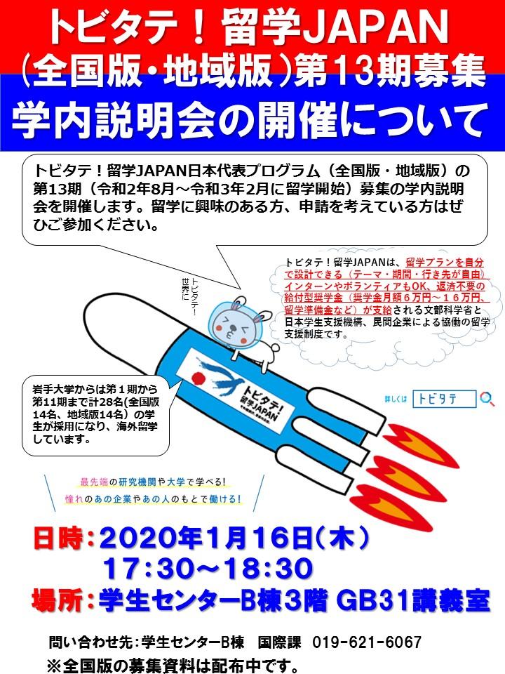 トビタテ!留学JAPAN(全国版・地域版)募集説明会の開催について(2020.1.16) (2020.1.16 〜 2020.1.16)