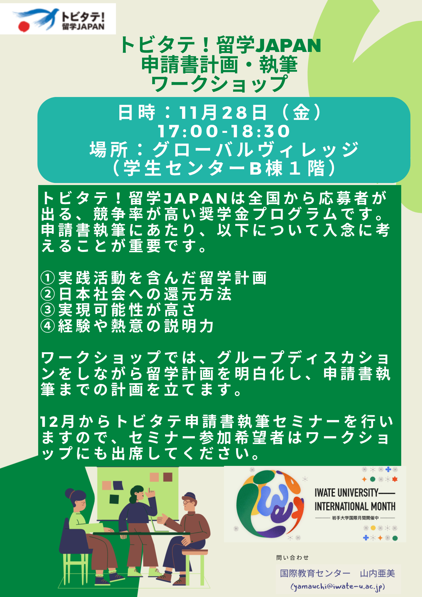 岩手大学では、国際月間の一環として、11月28日に「トビタテ!留学JAPAN申請書計画・執筆ワークショップ」を行います。