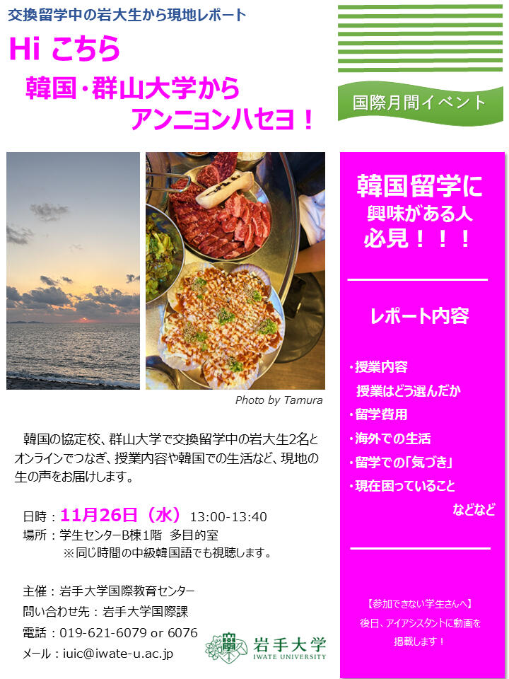 韓国の協定校、群山大学で交換留学中の岩大生2名とオンラインでつなぎ、授業内容や韓国での生活など、現地の生の声をお届けします。