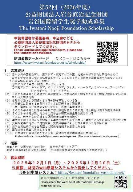 公益財団法人岩谷直治記念財団より、2026年度岩谷国際奨学助成の募集がありました。