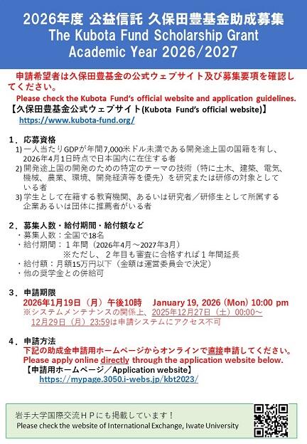 公益信託久保田豊基金より、2026年度公益信託久保田豊基金助成の募集が届いています。申請希望者は久保田豊基金の公式ウェブサイト及び募集要項を確認し、各自で直接応募してください。久保田豊基金公式ウェブサイト https://www.kubota-fund.org/※募集要項は公式ウェブサイトからダウンロードできます。
