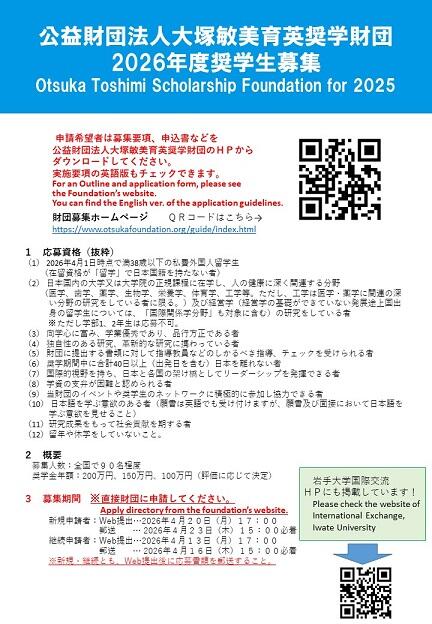 公益財団法人大塚敏美育英奨学財団 2026年度奨学生募集 Otsuka Toshimi Scholarship Foundation for 2026