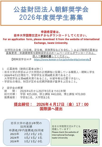 公益財団法人朝鮮奨学会より、2026年度の奨学生の募集案内が届きました。