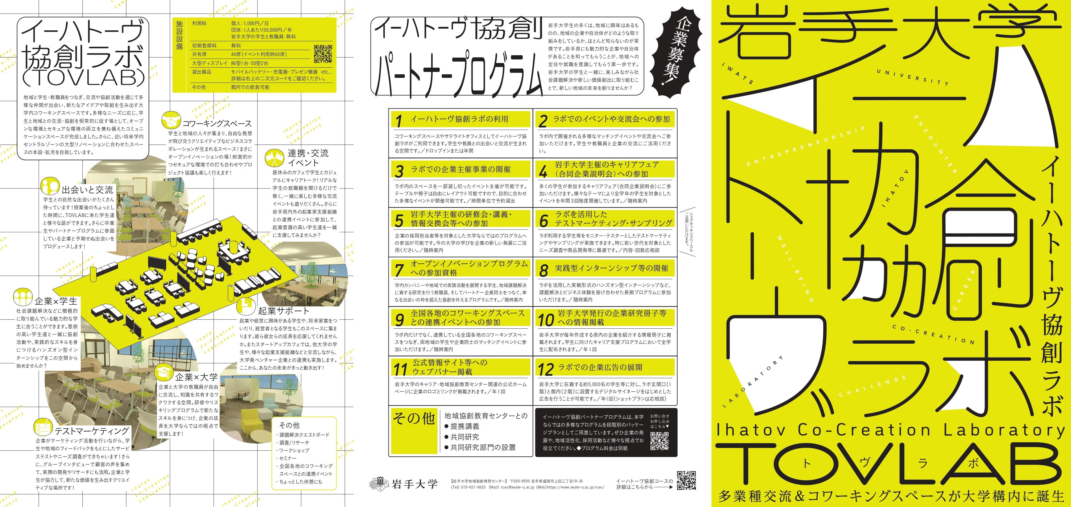 イーハトーヴ協創ラボは、地域と学生・教職員をつなぎ、交流や協創活動を通じて多様な仲間が出会い、新たなアイデアや取組を生み出す大学内コワーキングスペースです。多様なニーズに応じ、学生と地域との交流・協創を恒常的に促す場として、オープンな環境とセキュアな環境の両立を兼ね備えたコミュニケーションスペースが完成しました。さらに、近い将来学内セントラルゾーンの大型リノベーションに合わせたスペースの本設・拡充を目指しています。